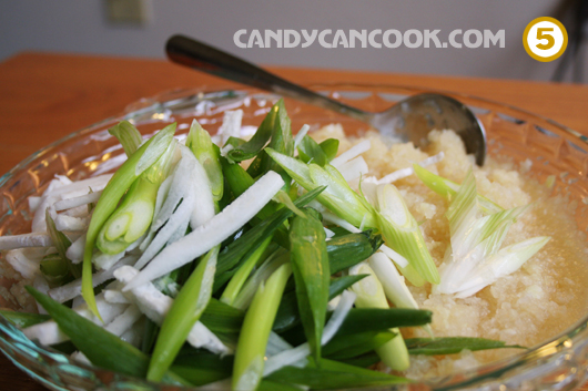 - Để hoàn thành hỗn hợp muối Kim Chi thì trộn: chỗ hỗn hợp vừa xay ra nè, củ cải với hành thái sợi nè, trộn với khoảng ¼ cup ớt bột (khoảng nửa bát con đựng nước mắm nhé), ¼ cup nước mắm và ¼ cup đường nữa. Trộn đều lên và nếm thử thấy vị mặn với ngọt vừa là được. Cái này chính là lúc tớ nói là theo cảm tính đấy. K nên nhiều mắm quá vì cải thảo sau khi 2 tiếng ngâm với nước muối cũng khá là đậm đà rồi và vị ngọt là để dịu bớt, còn có cả chút vị cay nữa. Để muối 1 thời gian còn là vị chua nhưng k phải chua gắt như dưa chua của mình đâu nhé. Tả nghe thì khó nhưng ai đã từng ăn kim chi thì sẽ có cái cảm giác đó :D hihi …