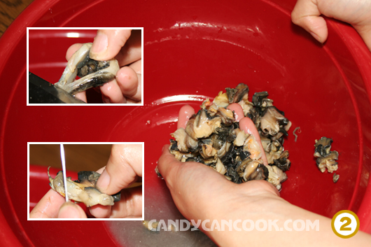 - Trong lúc ninh nước dùng thì bắt đầu làm sạch ốc. Cái này làm hơi lâu vì phải nhặt từng con ốc … Tớ cắt hết những thứ “bèo nhèo” của con ốc, rồi lấy đầu dao rạch và là sạch con ốc như trong hình (cái này khó tả bằng lời quá :-s) …Sau đó để rửa cho sạch mùi tanh, cho 2-3 thìa dấm, một chút muối vào dùng tay bóp sạch ốc rồi rửa qua nước sạch lại …