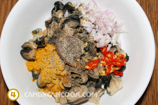 - Tiếp đến là ướp ốc: cho 1/2 teaspoon bột nghệ, 1 tablespoon hành băm, ½ thìa teaspoon mắm tôm, 1/2 teaspoon đường; chút hạt tiêu và cắt thêm 1 quả ớt vào nhé. Trộn đều lên ướp khoảng 10-15’.