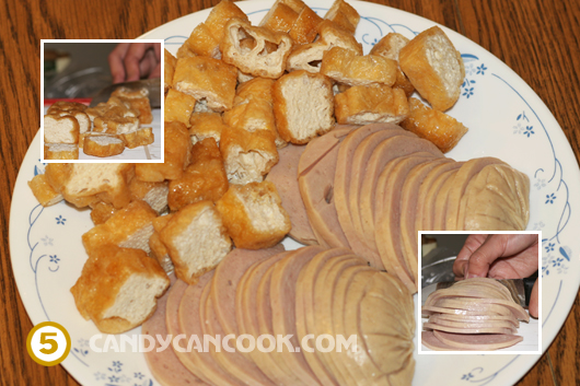 - Cắt đậu thành miếng vừa ăn rồi rán vàng