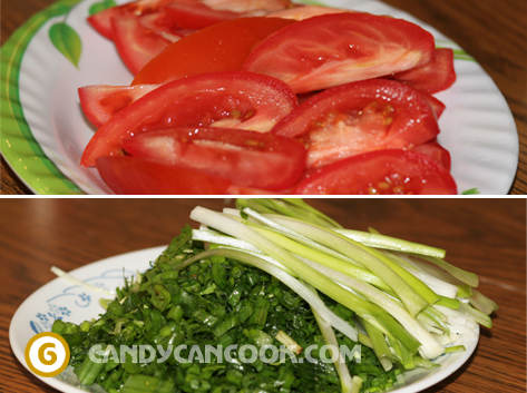 - Các loại rau, cà chua, hành lá, mùi tàu đem rửa sạch, thái nhỏ. Cà chua thái thành hình cau.