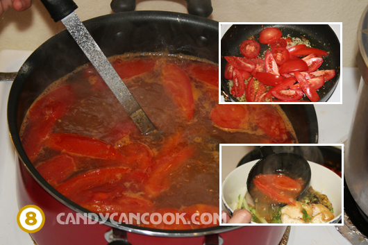 - Tiếp đó dùng chính chảo xào ốc, phi 2-3 Tablespoons hành băm cho thơm rồi cắt thêm 1-2 quả ớt (tùy theo khẩu vị ăn cay của bạn nhưng nhất định phải có ớt cho món này mới ra vị. Ớt khi được nấu qua thế này sẽ k cay xè mà nó sẽ làm nên vị bún ốc tuyệt vời đó :D), rồi đổ cà chua, nêm thêm chút mắm với gia vị vào xao qua cà chua cho thấm rồi đổ tất cả vào nồi nước dùng.