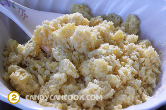 - Đậu xanh cũng có thể nấu lên như nấu xôi bằng nồi cơm điện hoặc hấp chín. Nếu hấp chín thì nhớ ngâm đỗ cũng qua đêm (khoảng 8-12 tiếng). Khi hấp thì nhớ rắc thêm vài hạt muối nhé. Sau đó dùng một cái thìa nghiền đậu xanh lúc còn nóng (cả nhà có thể tham khảo thêm bài Bánh chay về cách làm đậu xanh nè) … Sau đó dùng một tờ plastic wrap cho đậu xanh vào và nặn thành một viên đậu xanh tròn và to. Cái này được gọi là xéo :D