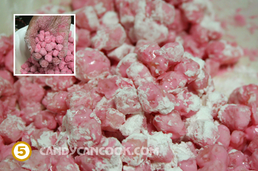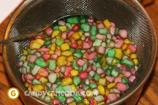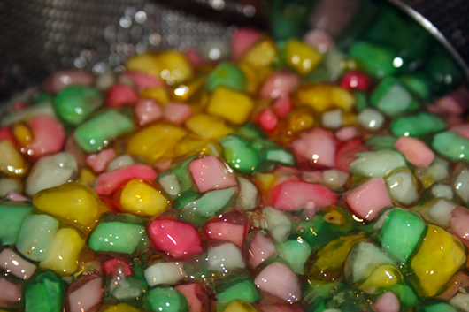 • Thế là gần xong rồi đó :P Cách luộc hạt lựu sau khi bao bột thì y hệt như cách luộc hạt trân châu. Luộc riêng từng màu nhé và lưu ý là sau khi xối qua nước lạnh thì cho một chút đường hoặc mật ong vào trộn đều để cho chè dai.