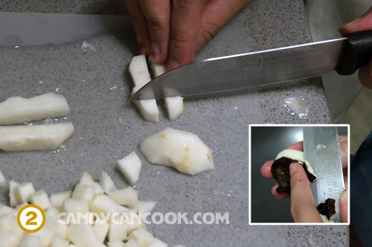• Tranh thủ thời gian ta bát đầu gọt sạch củ mã thầy rồi ngâm vào nước lạnh cho trắng. Sau đó sắt thành viên nhỏ giống hạt lựu. Nếu dùng loại đóng hộp thì chỉ cần sắt nhỏ ra thôi. Công đoạn này là kì công và lâu nhất vì củ năng đã nhỏ, lại phải gọt và rồi cắt nhỏ nữa. Có cô bé chỗ tớ bảo em k bao giờ gọt được củ mã thầy vì mỗi lần gọt xong đứt tay lia lịa :((
