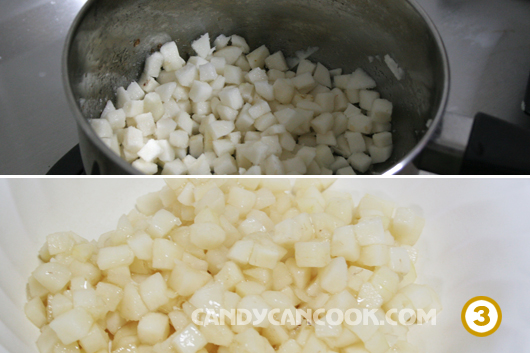 • Sau đó cho lên bếp xào với 2 tbsp đường trắng để củ mã thầy chín sơ và đặc biệt với loại đóng hộp thì có thể cho thêm 1 thìa đường nữa để tăng vị đậm của củ mã thầy. Lưu ý chỉ xào xơ thôi nhé.