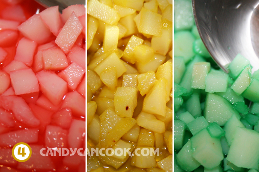 • Tiếp đến là giai đoạn yêu thích của tớ: pha nước phẩm màu. Nếu bạn muốn làm chè hạt lựu thì chỉ cần màu đó còn nếu thích thì có thể làm nhiều màu cho vui mắt ^^ Tớ thì chia ra làm 3 và nhuộm luôn 3 màu: xanh, đỏ, vàng cho màu mè yêu đời tí hihi :P Sau đó ngâm hạt lựu bằng củ mã thầy vào để nhuộm màu trong khoảng 15’-20’. Hồi ở Singapore tớ dùng loại phẩm màu chỉ cần cho tí xíu vào là đỏ mà ở bên Mĩ này thì cho mấy giọt vẫn chưa ăn thua. Cả nhà cứ tùy vào lượng màu thích cho đậm nhạt thì ngâm nhé. Chỉ lưu ý là nên ngâm màu đậm một chút thì tí nữa mình bao bột bên ngoài lúc luộc lên mới có màu đẹp đc :P