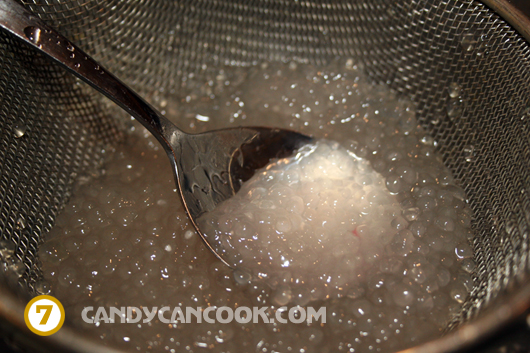 • Trong lúc chờ nhuộm màu củ mã thầy cả nhà đun nước sôi rồi cho hạt trân châu vào luộc chín, rồi đổ qua rây và xối qua nước lạnh, cuối cùng là cho một chút đường hoặc mật ong vào cho hạt trân châu dai. Tham khảo kĩ thêm cách luộc trân châu ở bài Chè xoài nhá ^^