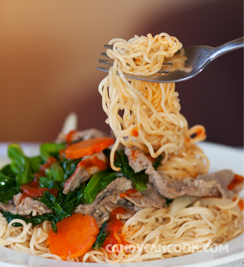 Hnay tớ muốn giới thiệu một món ăn rất thú vị, nhanh gọn, đảm bảo đổi vị cho bữa ăn rất hay ^^… Đó là “mì gói xào thịt bò”. Ai mà chẳng đã từng một lần trong đời ăn mì gói nhỉ :P Riêng tớ, tớ được biết đến nhiều cách ăn mì gói nhất đó là từ thời đại học. Con bạn thân nhất của tớ thời đại học là “vua”, à không, “nữ hoàng mì gói” :P … Có mỗi gói mì gói mà nàng chỉ tớ biết bao nhiêu cách ăn nhé. Cách đơn giản nhất và thông dụng nhất, ai cũng biết là cho tất cả vào cái bát rồi rót nước sôi và chờ mì nở ra rồi ăn thôi :D … Nàng còn chỉ tớ cách bóp vụn mì gói ra rồi cũng rót nước sôi vào ăn khi mì nở ra. Cách này ăn cảm giác như ăn cháo mì gói, rất lạ. Rồi cách ăn mì trộn, đổ nước sôi vào mì trước rồi đổ nước đi và cho gia vị vào trộn lên ăn như kiểu mì khô. Khi nào k có cả nước sôi ăn nữa thì có bóp mì gói vụn ra, rồi trộn chút gia vị và ăn sống thôi ;)) Một kiểu ăn snack rất sáng tạo :D … Con bạn tớ thì khen tớ và bảo tao tin là sau này mày sẽ trở thành một bà nội trợ nấu mì gói giỏi nhất vì mày có con bạn là tao đây – chuyên gia mì gói :P hihi … Sở dĩ nói vậy vì nó chê các bà mẹ nấu mì gói dở tệ vì thường cho quá nhiều thứ vào bát mì gói, dẫn tới mì nấu bị nở quá, ăn hết cả vị ngon của mì hihi … Thú thật là cho tới khi học đại học tớ mới thích và mê mì gói vì hồi xưa mẹ tớ nấu mì gói cho ăn mà tớ cũng cảm thấy … khó nuốt :P (Mẹ ơi, con xin lỗi mẹ :(()