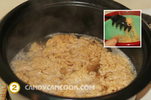 - Tiếp đến, cả nhà đun một nồi nước sôi (tớ cho 3 bát nước to). Sau đó cả nhà thả mì gói vào và cắt một gói gia vị vào nhé. Tớ thường chỉ cho vào một chút rồi tắt bếp và để khoảng 1’ để mì tự nở ra là tớ vớt ra ngay vì nếu để mì bị nhũn thì tí nữa xào lên sẽ rất dở. Đây là một bước quan trọng quyết định tới thành công của món này đấy ^^ Sau đó, vớt mì ra một cái rổ rồi dội qua nước lạnh và để ráo nước nhé.