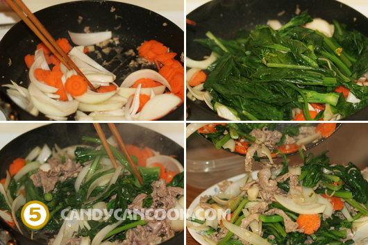 - Bây giờ là bước xào thịt bò và các loại rau. Cho dầu ăn vào chảo rồi phi hành, tỏi thơm lên, sau đó cho thịt bò vào đảo nhanh tay. Lưu ý là chỉ xào thịt bò tái rồi đổ ra một cái đĩa nhưng để lại nước thịt bò để tiếp tục cho cà rốt, hành tây vào xào nhanh tay (2 thứ này cũng nhanh chín lắm). Cuối cùng là đổ đĩa rau cải đã trần qua vào thôi. Cho thêm độ khoảng 2 tbsp dầu ăn vào cho các loại rau mềm và nhìn bong hơn, nêm nếm gia vị và một chút mắm vừa ăn. Món này mình xào nhiều lần nên khi nấu cả nhà nhớ tập trung cẩn thận vì rất dễ cho quá tay và bị mặn nhé. Đổ thịt bò vào và đảo trộn đều lên là tắt bếp và đổ tất cả ra một cái đĩa.