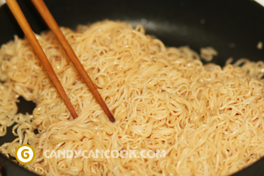 - Cuối cùng là dùng chính cái chảo đó, cho thêm khoảng 1 tbsp dầu ăn và đổ mì gói vào xào cho nóng và dòn. Tùy vào khẩu vị cả nhà có thể chỉ xào cho nóng hoặc nếu thích ăn thật dòn thì để trên bếp lâu hơn một chút. Tớ k dùng nhiều dầu ăn vì mì gói thực chất là rất béo và có rất nhiều dầu ăn nên nếu cho nhiều dầu ăn lên một chút là rất dễ ngán cả nhà ạ. Mách nhỏ cả nhà là nếu dùng chảo k dính xào thì sẽ dễ xào và ngon hơn đấy.