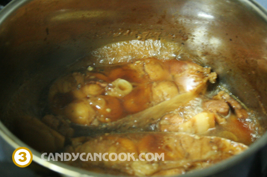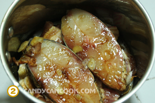 Đun cá ở lửa to trước rồi ở lửa vừa khoảng 5′ cho cá thấm gia vị.