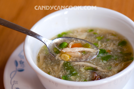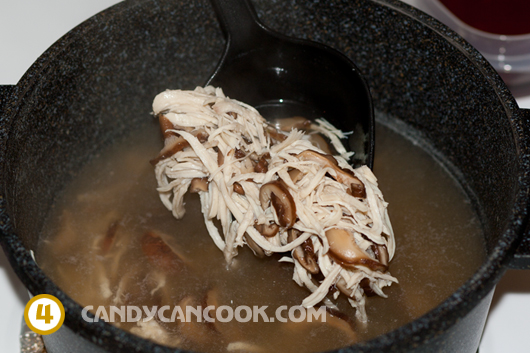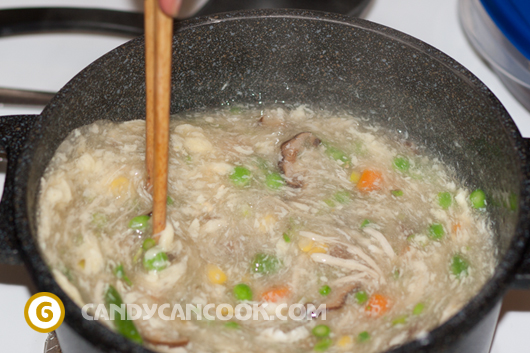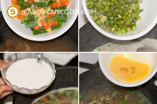 - Tiếp đến cho nấm hương vào trước. Cho hết cả nước ngâm nấm hương cho thơm rồi đun sôi và ninh nhỏ lửa khoảng 5’ cho mùi nấm hương thơm. Sau đó cho gà vào cũng đun sôi súp lên lại và ninh khoảng 3’. Tiếp đến là hỗ hợp rau đông lạnh. Cái này các bạn nấu cũng nhanh thôi, khoảng 1-2 phút là được và cuối cùng là măng tây. Sau đó để nước sôi lại và để lửa Med-hi rồi từ từ một tay đổ hỗn hợp bột năng vào nồi súp, một tay khuấy nhẹ nồi súp để làm cho nồi súp sánh lại một chút. Lưu ý là khuấy đều tay nhé :D …