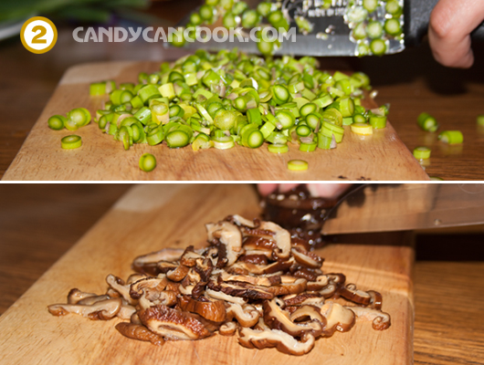 - Sau đó thái nhỏ măng tây, nấm hương (nấm hương thái nhỏ xong vẫn cứ cho vào bát nước ngâm), thái cà rốt (nếu k dùng hỗn hợp rau đông lạnh sẵn). Nếu dùng hỗn hợp rau đông lạnh nhớ bỏ ra chừng 1 cái bát nhỏ một lúc trước khi nấu.