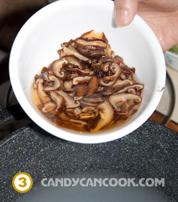 - Đầu tiên là ngâm nấm hương vào nước ấm. Cả nhà rửa sạch nấm hương và ngâm vào một cái bát con nhé. Tí nữa mình sẽ dùng cái nước ngâm nấm này cho vào nồi súp sẽ làm súp thơm hơn đấy.