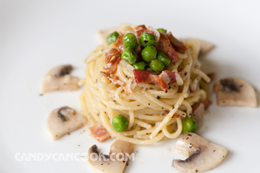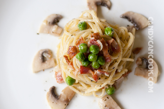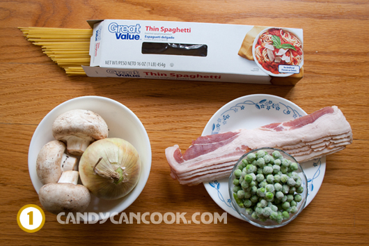 Loại pasta tớ giới thiệu với cả nhà hôm nay rất dễ nấu và đặc biệt là nguyên liệu rất dễ kiệm nữa. Nước sốt của món pasta này là cream sauce (sốt kem) nấu với bacon, đậu hà lan và nấm. Loại pasta tớ dùng là loại spaghetti mỏng (thin spaghetti). Tất cả những nguyên liệu này đều có thể dễ dàng kiếm ở bất kì đâu (Châu Âu, Châu Á hay Châu Mĩ :P) vì thế cả nhà hãy thử xem nhé. Tớ đảm bảo cả nhà sẽ thích mê vì mùi thơm của bacon hòa quện với nấm, đậu hà lan cùng với heavy whipping cream (hoặc sữa) tạo nên vị béo ngậy. Đặc biệt lần này tớ áp dụng tất cả những phương pháp học được từ sách vở, film ảnh và TV nên hi vọng cả nhà sẽ thích ;) Let’s start now!