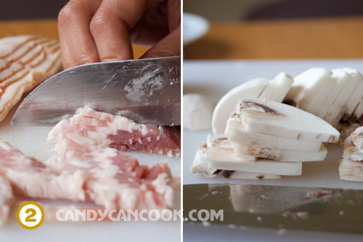 - Trước hết cắt thịt bacon (xông khói) thành miếng nhỏ như trong hình, sau đó cắt hành tây và nấm theo hướng dẫn ở hình nhé. Đặc biệt là cách cắt hành tây nhỏ. Lưu ý là giữ phần gốc hành thì sẽ dễ hơn vì hành không bị long ra và cắt đều hơn đấy cả nhà ạ.