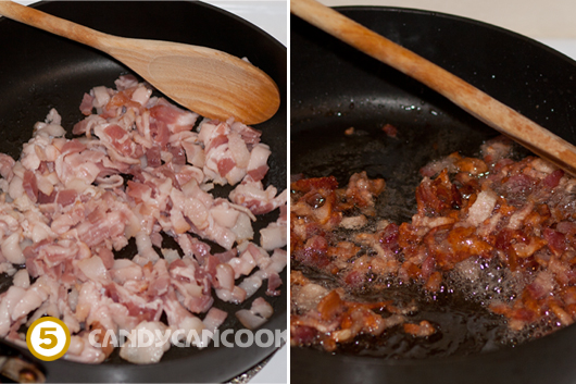 •  Bắc 1 cái chảo to lên rồi cho thịt xông khói (bacon) vào chảo và để lửa medium để mỡ của thịt xông khói ra. Để chừng khoảng 5-10 tới khi thịt xông khói chín vàng thì cho hành tây vào xào cùng. Đậy vung đun khoảng 2-3 phút cho hành chín mềm, rồi cho basil khô vào. Lá basil là một trong những nguyên liệu cơ bản tạo nên mùi thơm của pasta đấy cả nhà ạ. Nếu dùng loại hung quế tươi thì băm nhỏ và cho vào sau cùng nhé.