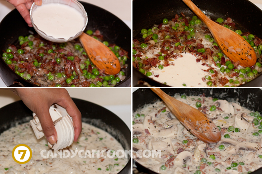• Đảo đều rồi cho heavy whipping cream hoặc sữa tươi vào. Thịt xông khói ở bên Mĩ tớ thấy mặn hơn mấy loại tớ đã dùng ở châu Á nên lúc này cả nhà có thể tùy khẩu vị tra thêm chút hạt tiêu và muối vào nhé (Nhớ là không dùng mắm cho đồ tây :D). Đun sôi và đun nhỏ lửa khoảng 5 phút rồi cho đậu Hà Lan và nấm vào. Đun nhỏ lửa khoảng 2-3 phút nữa để cho các thứ chín đều và hòa quện với nhau. Nêm nếm một lần nữa cho vừa miệng là hoàn thành xong nước sốt rồi đó cả nhà ạ :D … Lưu ý là không nên cho mặn quá vì mình sẽ còn một lần đun nữa, sợ khi nước bốc hơi sẽ dẫn tới bị mặn.