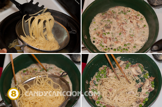 - Đảo đều rồi cho heavy whipping cream hoặc sữa tươi vào. Thịt xông khói ở bên Mĩ tớ thấy mặn hơn mấy loại tớ đã dùng ở châu Á nên lúc này cả nhà có thể tùy khẩu vị tra thêm chút hạt tiêu và muối vào nhé (Nhớ là không dùng mắm cho đồ tây :D). Đun sôi và đun nhỏ lửa khoảng 5 phút rồi cho đậu Hà Lan và nấm vào. Đun nhỏ lửa khoảng 2-3 phút nữa để cho các thứ chín đều và hòa quện với nhau. Nêm nếm một lần nữa cho vừa miệng là hoàn thành xong nước sốt rồi đó cả nhà ạ :D … Lưu ý là không nên cho mặn quá vì mình sẽ còn một lần đun nữa, sợ khi nước bốc hơi sẽ dẫn tới bị mặn.