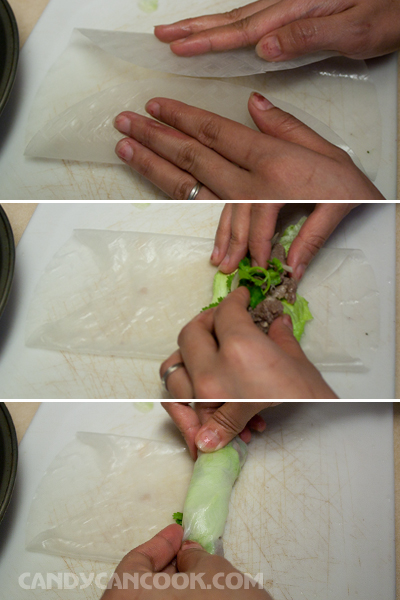 – Đặt một ít rau xà lách, một ít rau mùi, thịt bò vào rồi cuộn tròn lên tạo thành hình ống như phở cuốn thật. Nhớ cuốn chặt tay nhé. Lưu ý là muốn giống phở cuốn thật thì phải làm mỗi cái nhỏ nhỏ thôi cả nhà ạ :D