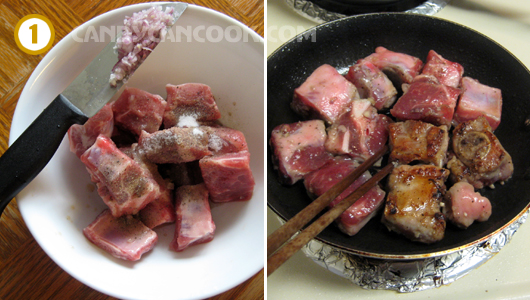 • Sau đó, cả nhà bắc chảo lên bếp, cho chút dầu ăn (không cần cho nhiều đâu nhé). Để cho chảo thật nóng rồi cho sườn vào rán ở nhiệt độ to vừa (med-hi). Mục đích của bước này là rán cho lớp ngoài của miếng sườn xém, có màu nâu đậm và làm cho thịt sườn thơm trước khi sốt.