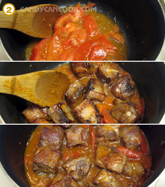 Xào cà chua, dằm nát rồi đổ sườn đã rán vào sốt cùng