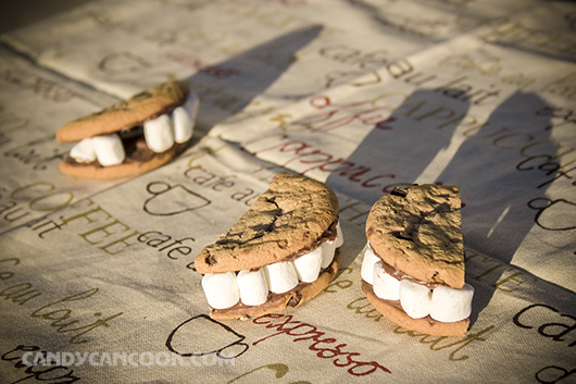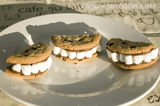 - Tiếp đến xếp marshmallow lên viền bánh tạo thành răng. Cái này không cần xếp thẳng hàng hoàn hảo, cứ tưởng tượng ra răng có thể siêu vẹo (thậm chí răng sứt thì làm thiếu 1 cái đi nhé haha) và cuối cùng đặt nửa bánh còn lại lên là xong rồi.