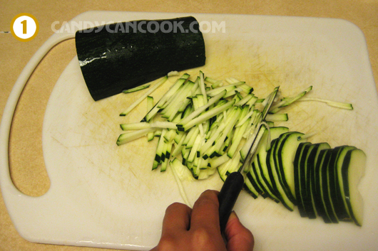 - Đầu tiên cả nhà rửa sách quả zucchini và thái sợi chỉ ra như trong hình.