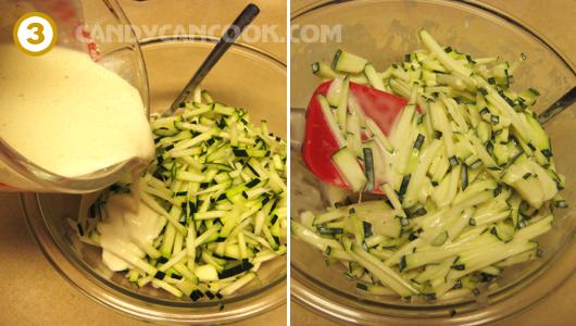 - Đổ bột đã pha trộn đều lên với zucchini. Cả nhà sẽ nhận thấy hầu như là rất ít bột, chủ yếu là zucchini). Thế là gần như xong rồi đấy cả nhà :D Giờ chỉ bắc chảo lên rán thôi.