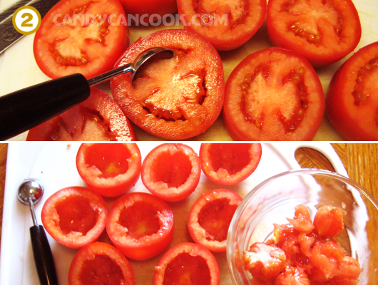 - Trong lúc đó, cả nhà chuẩn bị cà chua để nhồi. Cà chua rửa sạch rồi cắt đôi nếu là quả cà chua to dài (Tớ dùng loại cà chua Roma Tomato). Còn nếu là cà chua nhỏ hơn và tròn thì cả nhà cắt phần cuống bỏ đi là được nhé. Sau đó dùng một cái thìa hoặc dụng cụ để lấy phần ruộtcủa quả cà chua ra nhé. Lưu ý là giữ tất cả phần nước, hạt của cà chua lại vào một cái bát để lát nữa dùng nó tạo thành sốt cho món ăn này.