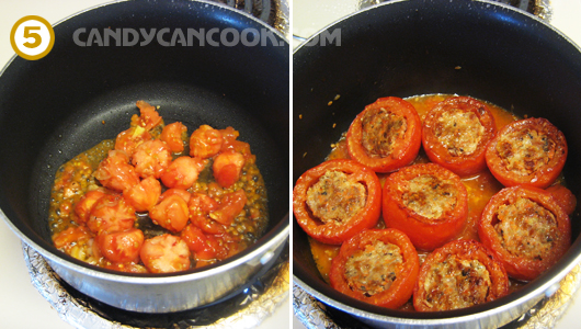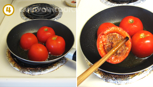 - Sau khi nhồi xong, cả nhà bắc chảo lên bếp cho một chút xíu dầu ăn (không cần nhiều đâu, khoảng 1-2 thìa là được nhé). Chảo nóng thì cho cà chua vào rán nhưng chỉ rán mặt thịt hở ra ngoài. Rán ở lửa vừa (medium) nhé. Quá trình này sẽ làm cho nhân chín mà cà chua không bị nát. Khoảng 10 phút khi thấy mặt thịt chín vàng thì bỏ ra đĩa và chuẩn bị sốt.
