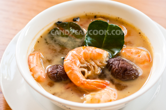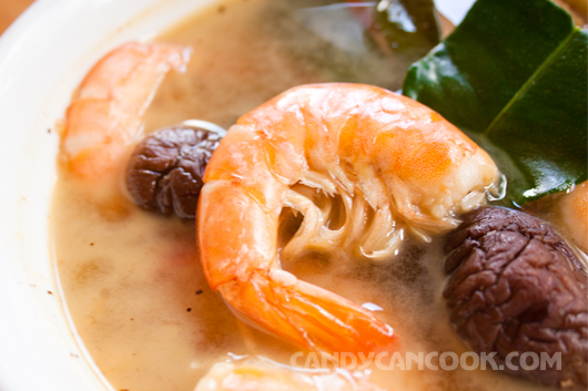 - Tôm làm sạch (bỏ chỉ, nhưng tớ thích ăn vỏ tôm nên không lột vỏ). Chuẩn bị và rửa sạch các nguyên liệu lá chanh Thái, riềng và sả. Dùng nấm tươi thì rửa sạch rồi cắt miếng vừa ăn hoặc dùng nấm hương thì ngâm cho nở rồi rửa sạch.