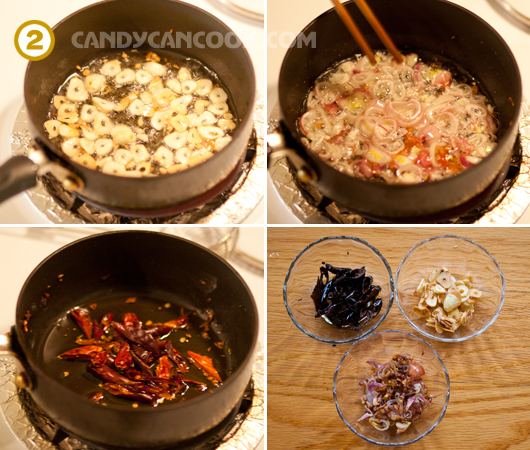 - Cho dầu ăn vào nồi rồi làm nóng dầu lên. Lần lướt cho tỏi, hành khô và ớt khô vào phi vàng nâu lên rồi vớt ra (ở lửa to vừa Med-Hi).