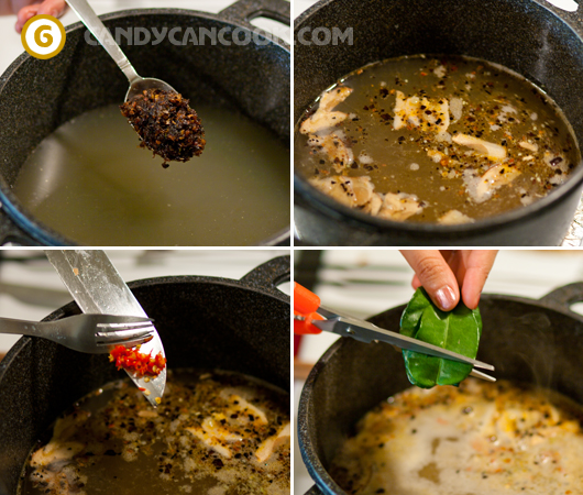 - Đổ nước ninh xương hoặc nước lọc nhưng cho 1-2 thìa hạt nêm vào một cái nồi. Tiếp đến cho sốt Tom Yum, rồi sả, riềng và ớt tươi băm nhỏ vào đun sôi lên. Nêm gia vị: nước chanh, nước mắm, đường vào cho vị chua ngọt mặm là được. Cắt lá chanh Thái vào lúc này để vẫn có mùi thơm mà lá chanh Thái không bị ninh lâu quá. Đun sôi bùng rồi ninh khoảng 2-3 phút cho các gia vị thấm.
