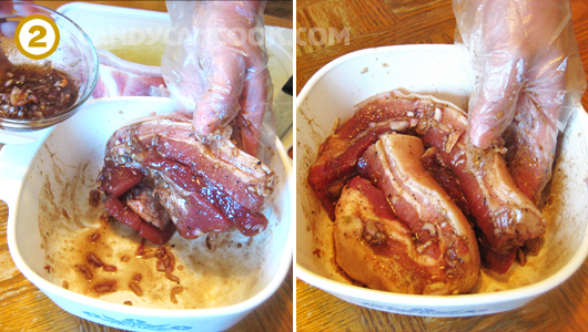 - Sau đó “mát xa” xoa đều bát gia vị vào thịt để thịt ngấm gia vị vào các mặt.