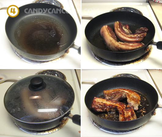 - Nếu ướp thịt trong tủ lạnh thì mang thịt ra ngoài để chừng 15’ để thịt bớt lạnh rồi hẵng bắt đầu rán (quay) nhé cả nhà. Tớ quay thịt bằng chảo (nên dùng chảo tốt, không dính và dày một chút thì thịt sẽ không bị cháy nhé). Cho một chút dầu ăn vào chảo và làm nóng rồi cho thịt vào quay ở lửa vừa. Lưu ý là thịt ba chỉ sẽ ra mỡ nên không cần cho nhiều dầu ăn nhé. Điều đặc biệt là tớ luôn đậy nắp vung khi quay thịt vì làm như vậy thì thịt sẽ nhanh chín mà lớp bên ngoài chỉ vàng vừa, không bị cháy. Nếu không đậy vung, do mình đã ướp đường thì rất dễ làm cháy bên ngoài nhưng bên trong thịt chưa chín. Tớ quay mỗi mắt khoảng 10 phút là được. Lưu ý nữa là khi mở nắp vung để đảo thịt, cả nhà phải nhanh tay bỏ nắp vung ra vì có thể hơi nước rơi xuống chảo có dầu sẽ bị bắn, rất nguy hiểm đấy.